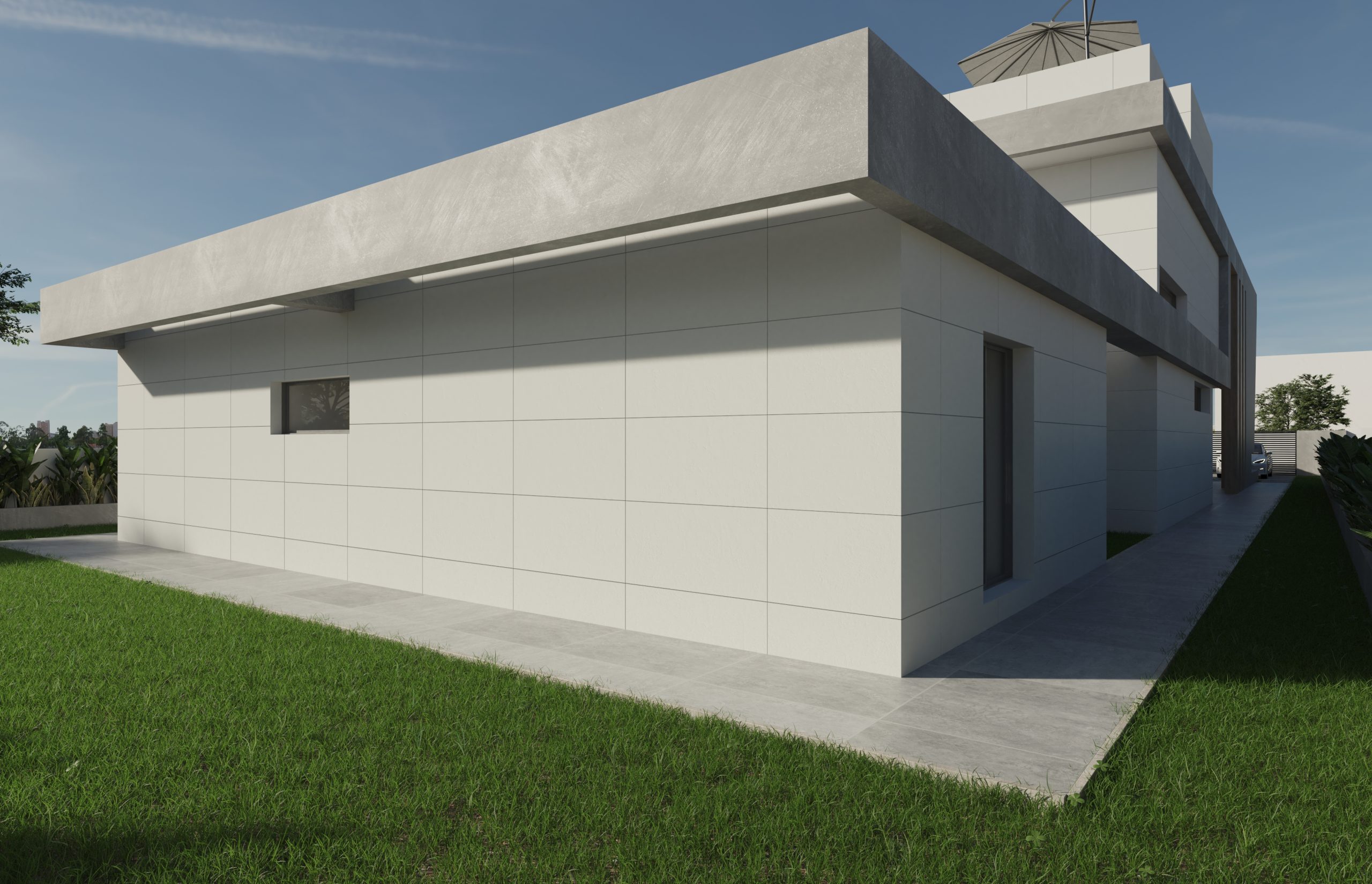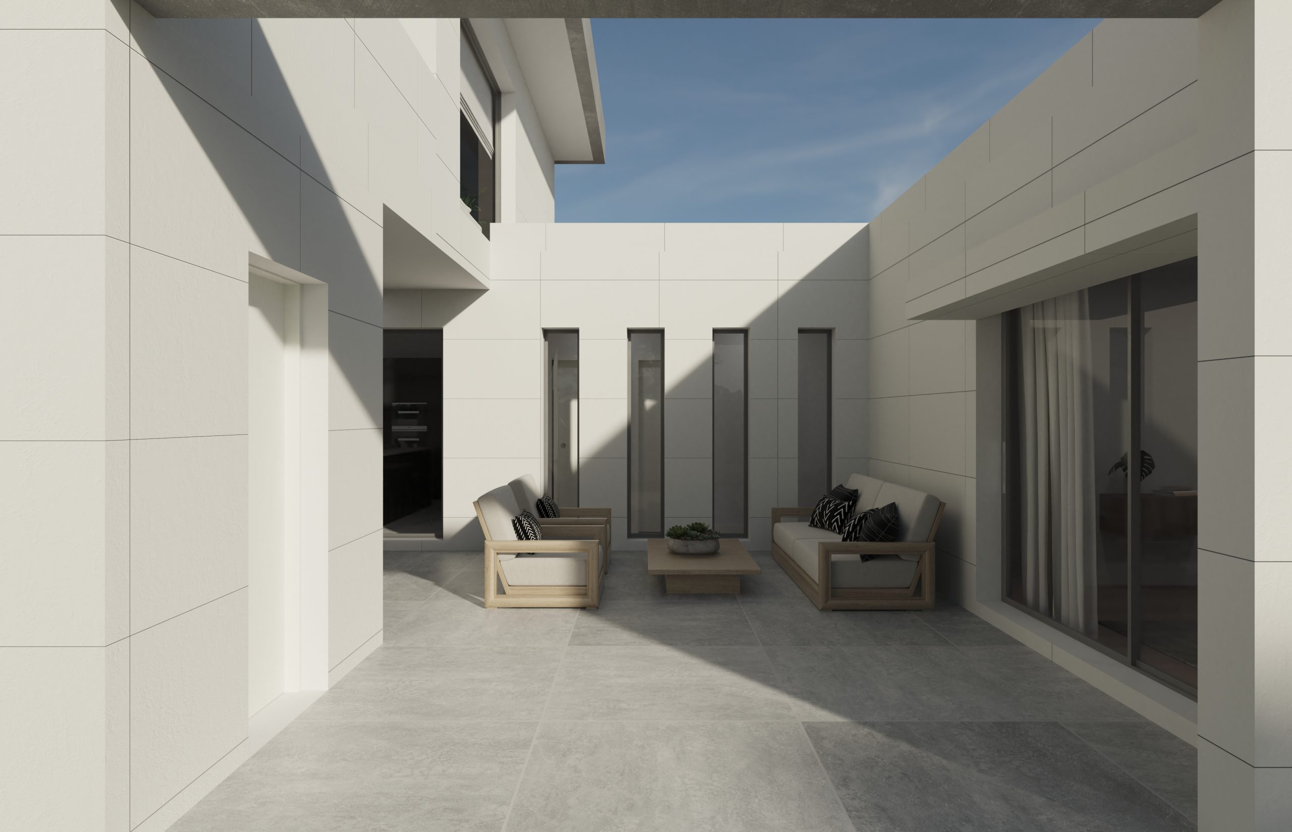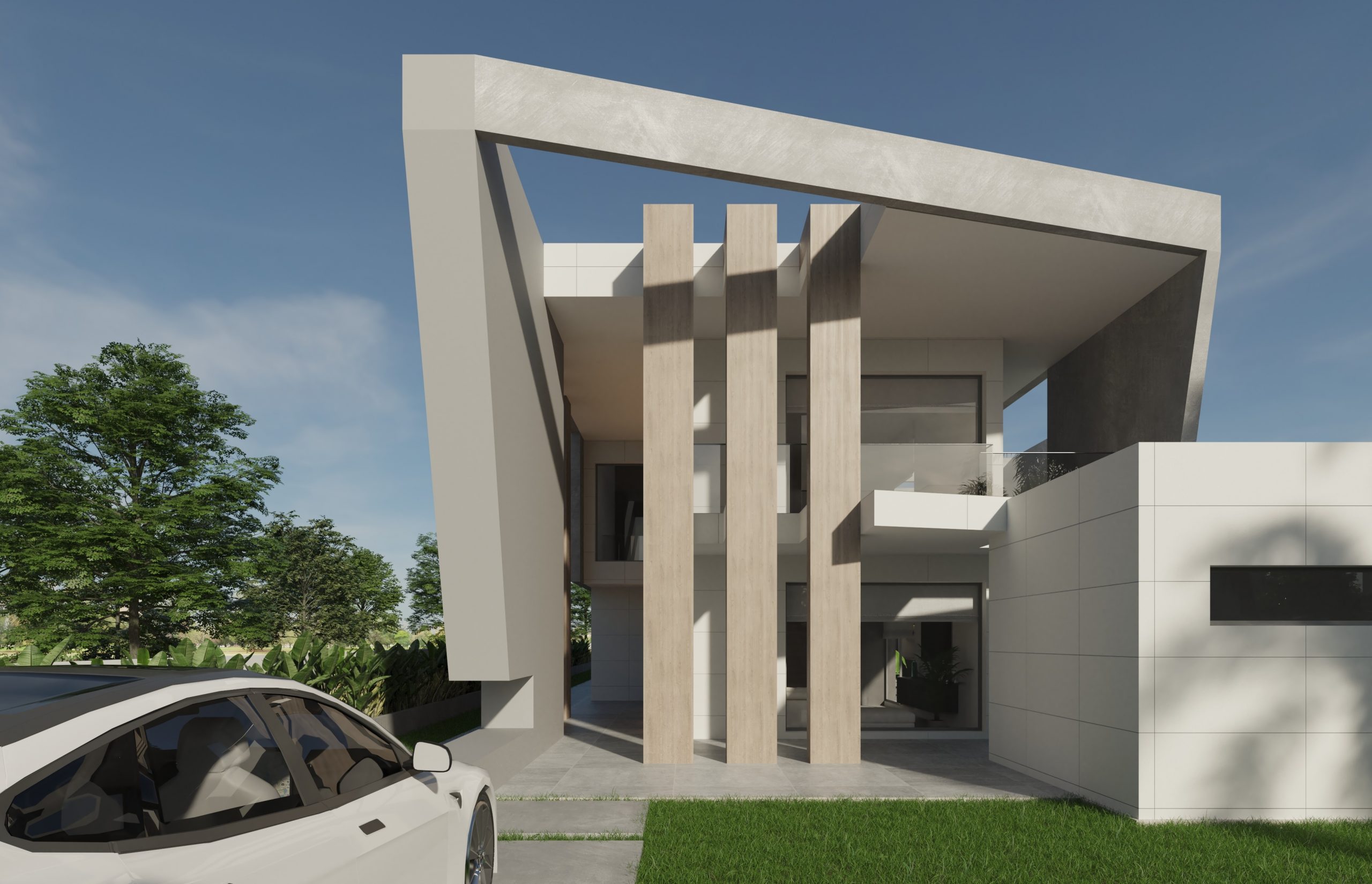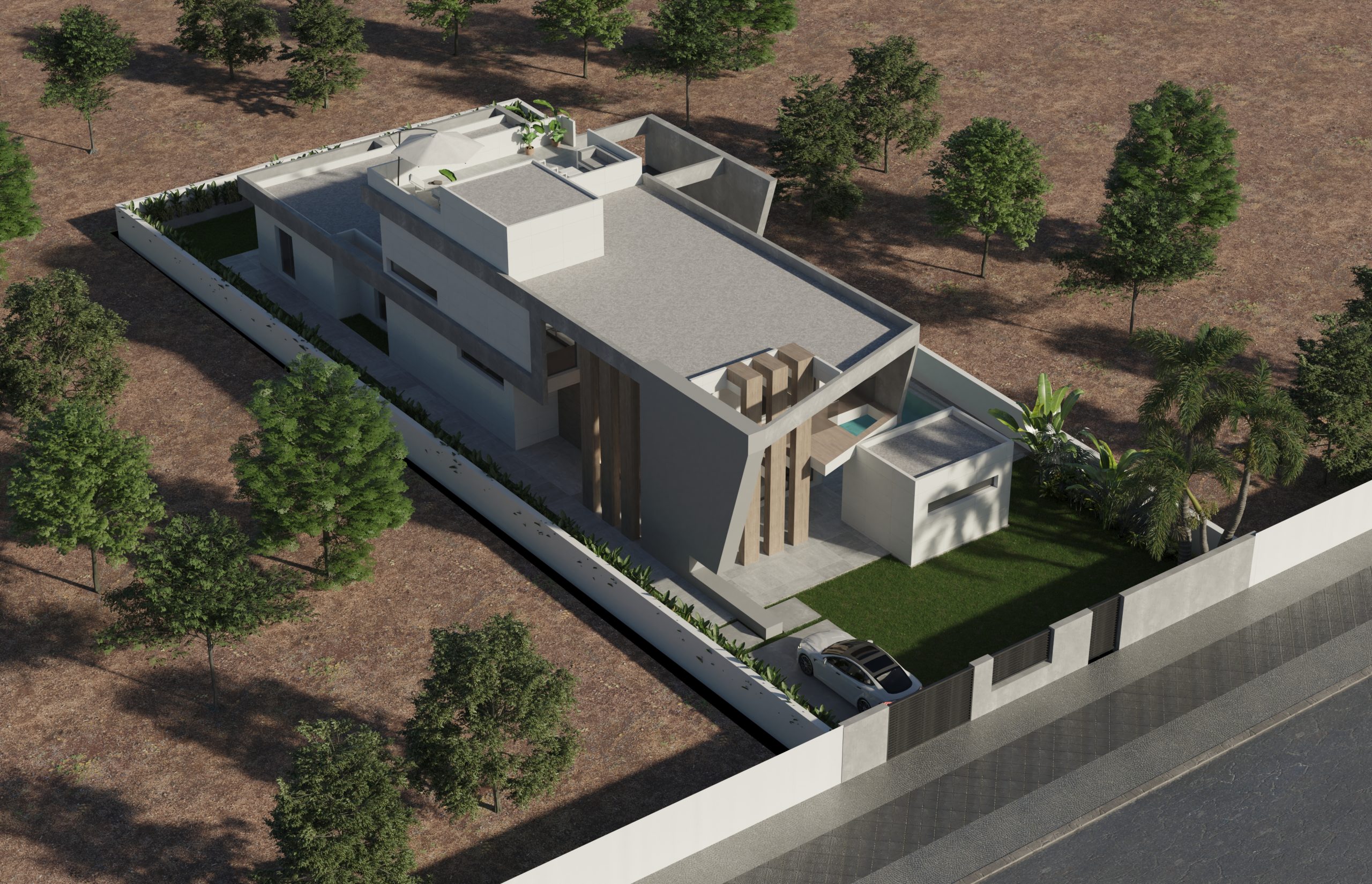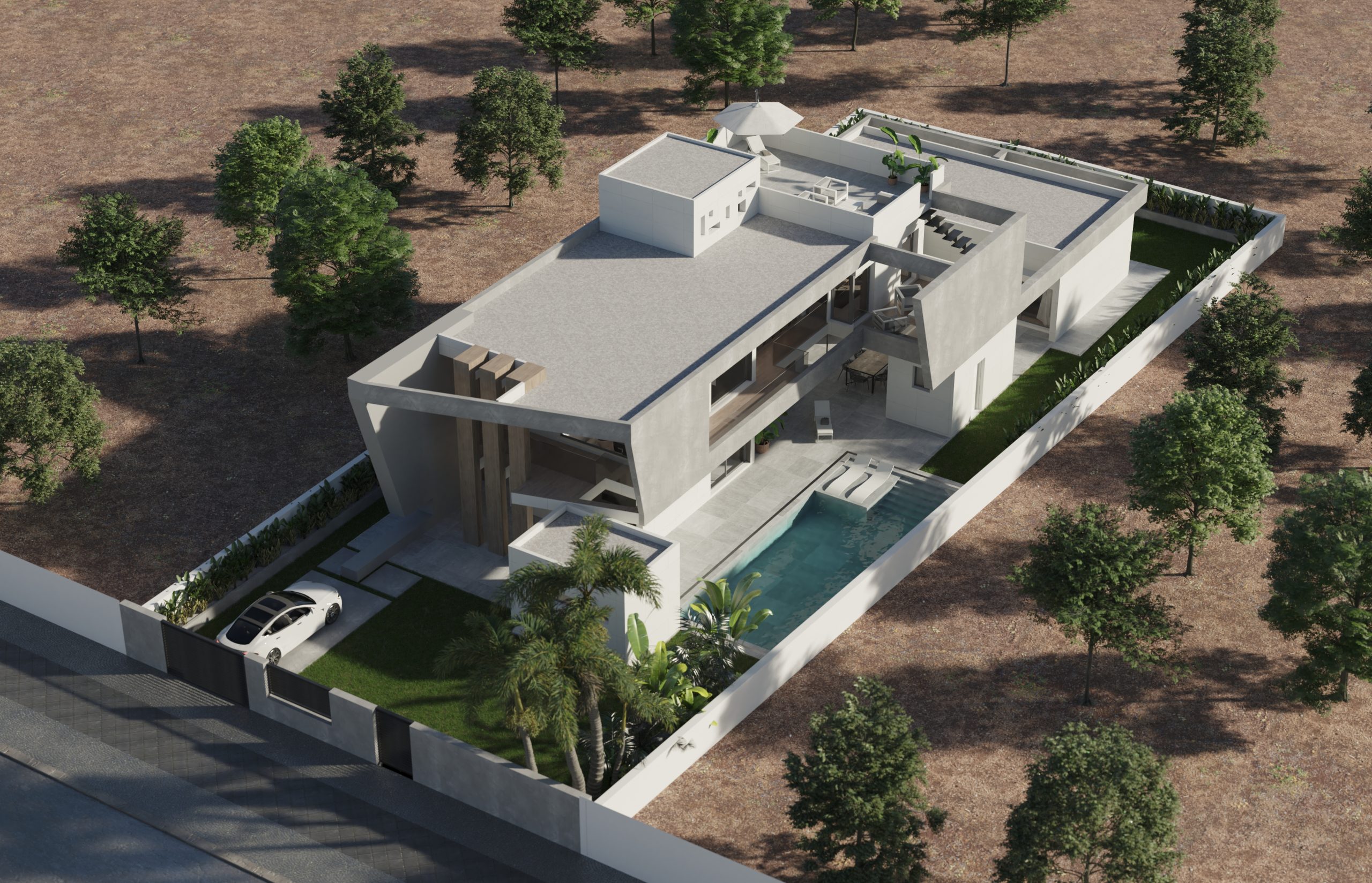 Juego de luces y volúmenes. La imagen del diseño elegido para la fachada principal de este proyecto transmite mucha fuerza y elegancia. Vivienda resuelta con dobles alturas, amplias terrazas y espacios muy abiertos al exterior. La entrada a la vivienda se ha resuelto como un elemento escultural y sin duda ha adquirido un protagonismo especial.