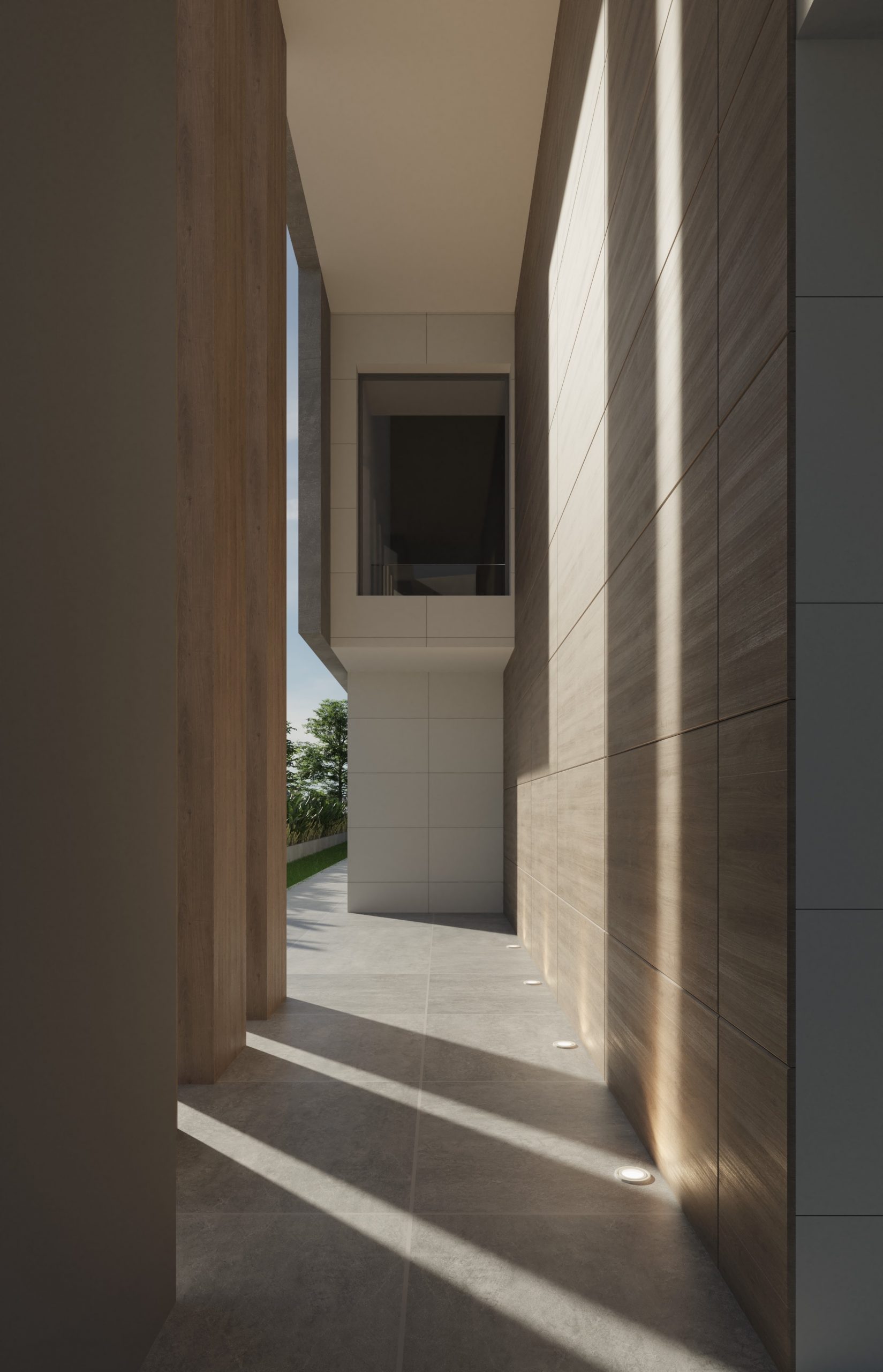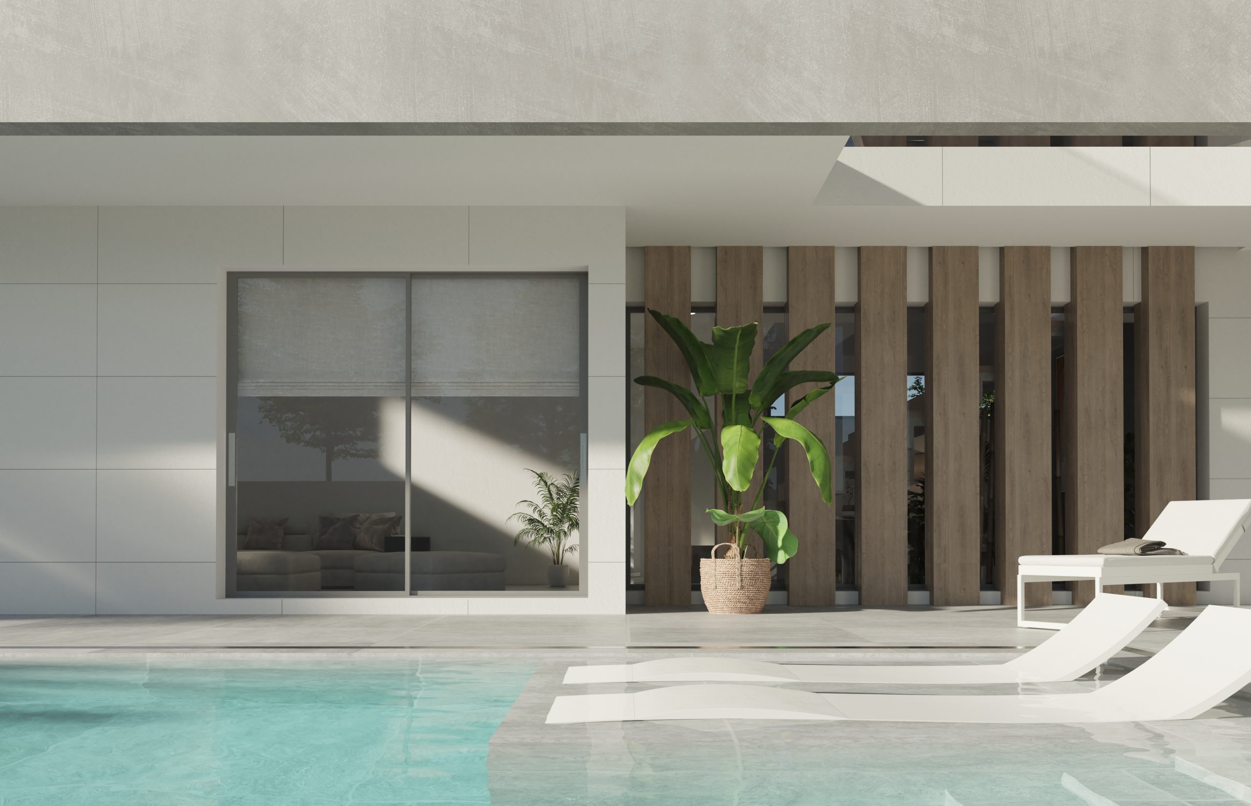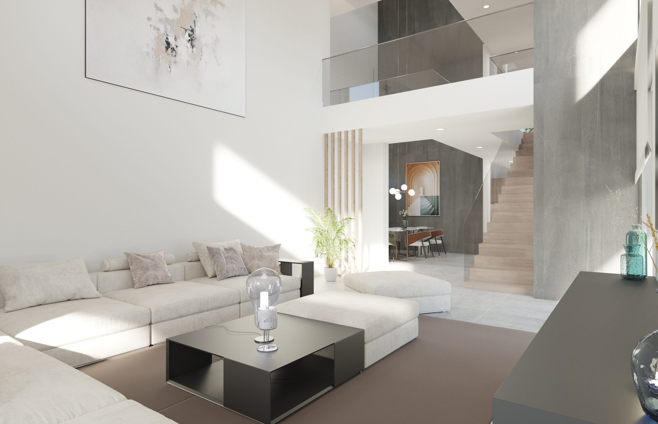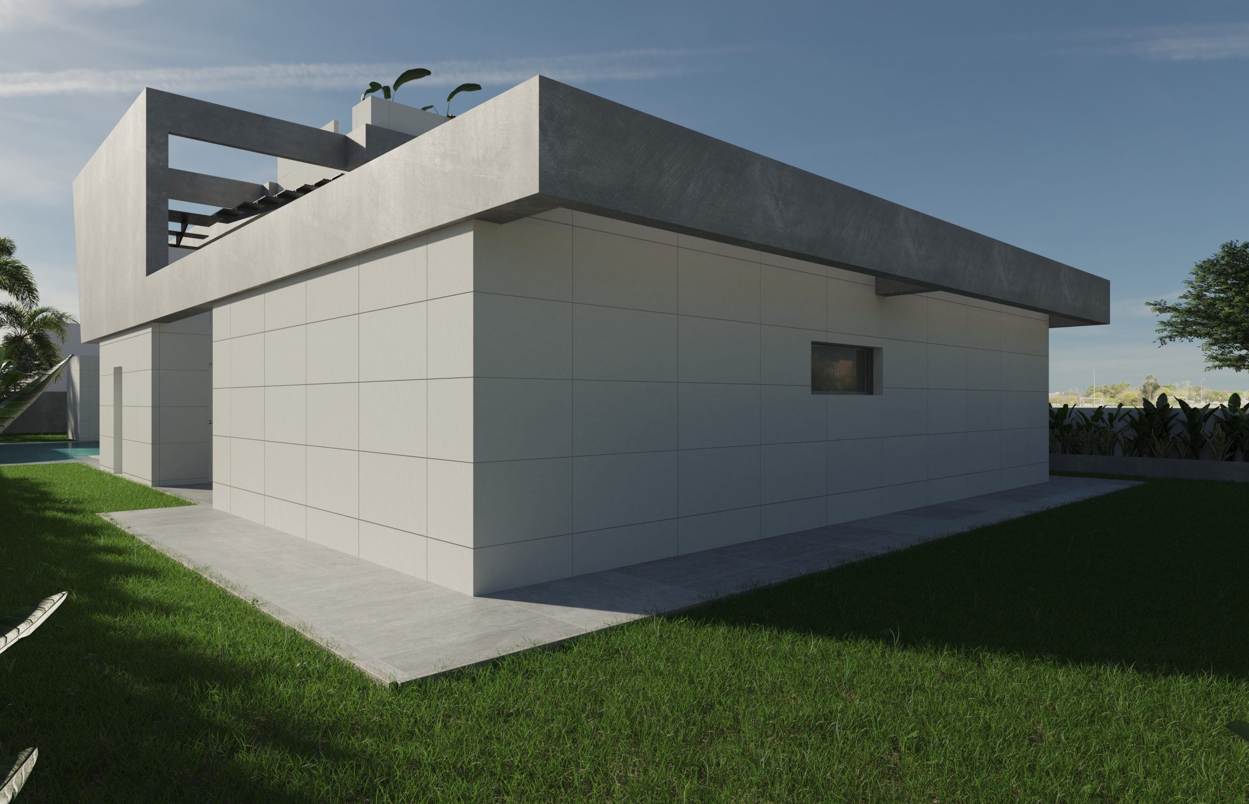 Juego de luces y volúmenes. La imagen del diseño elegido para la fachada principal de este proyecto transmite mucha fuerza y elegancia. Vivienda resuelta con dobles alturas, amplias terrazas y espacios muy abiertos al exterior. La entrada a la vivienda se ha resuelto como un elemento escultural y sin duda ha adquirido un protagonismo especial.