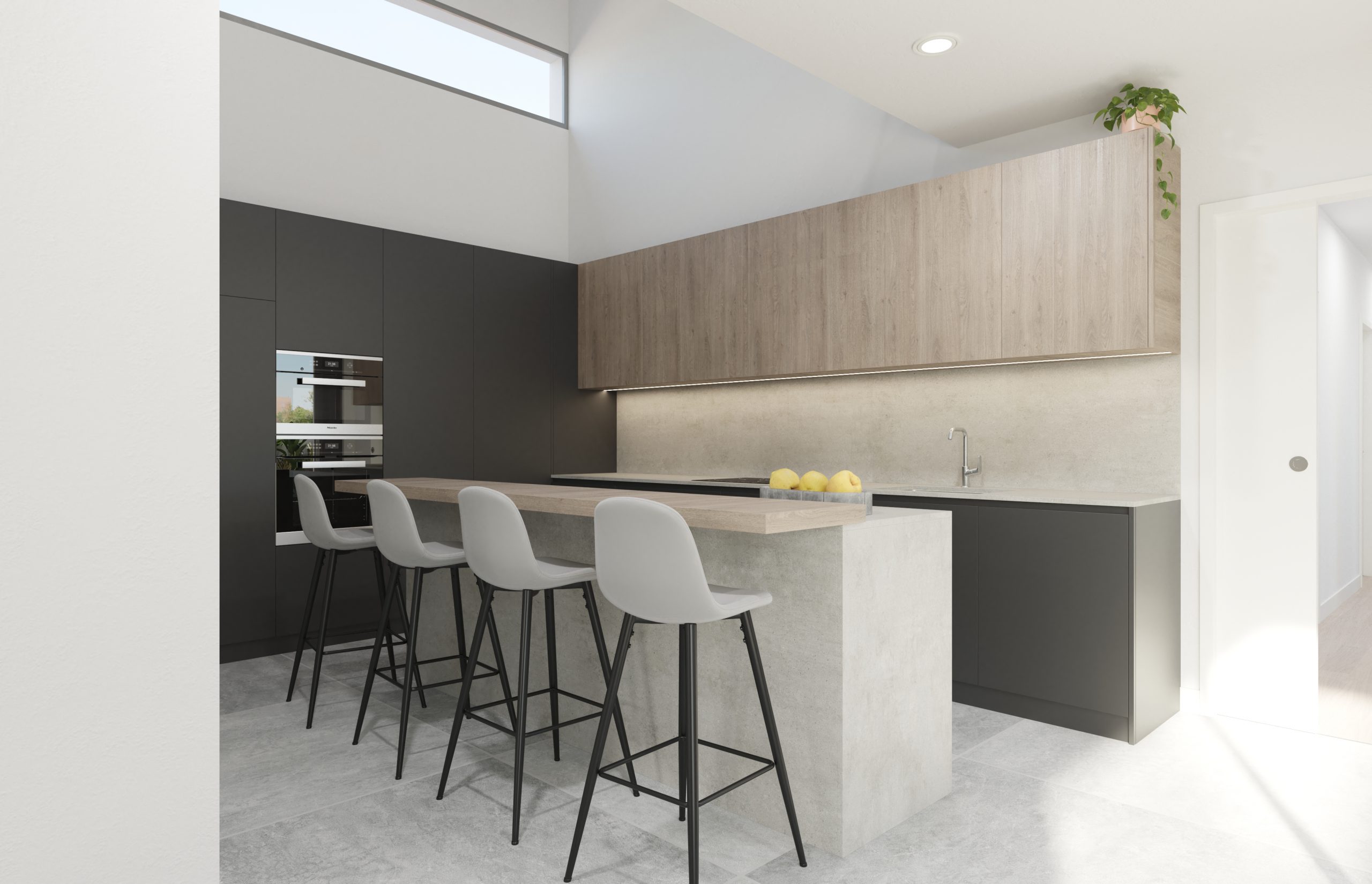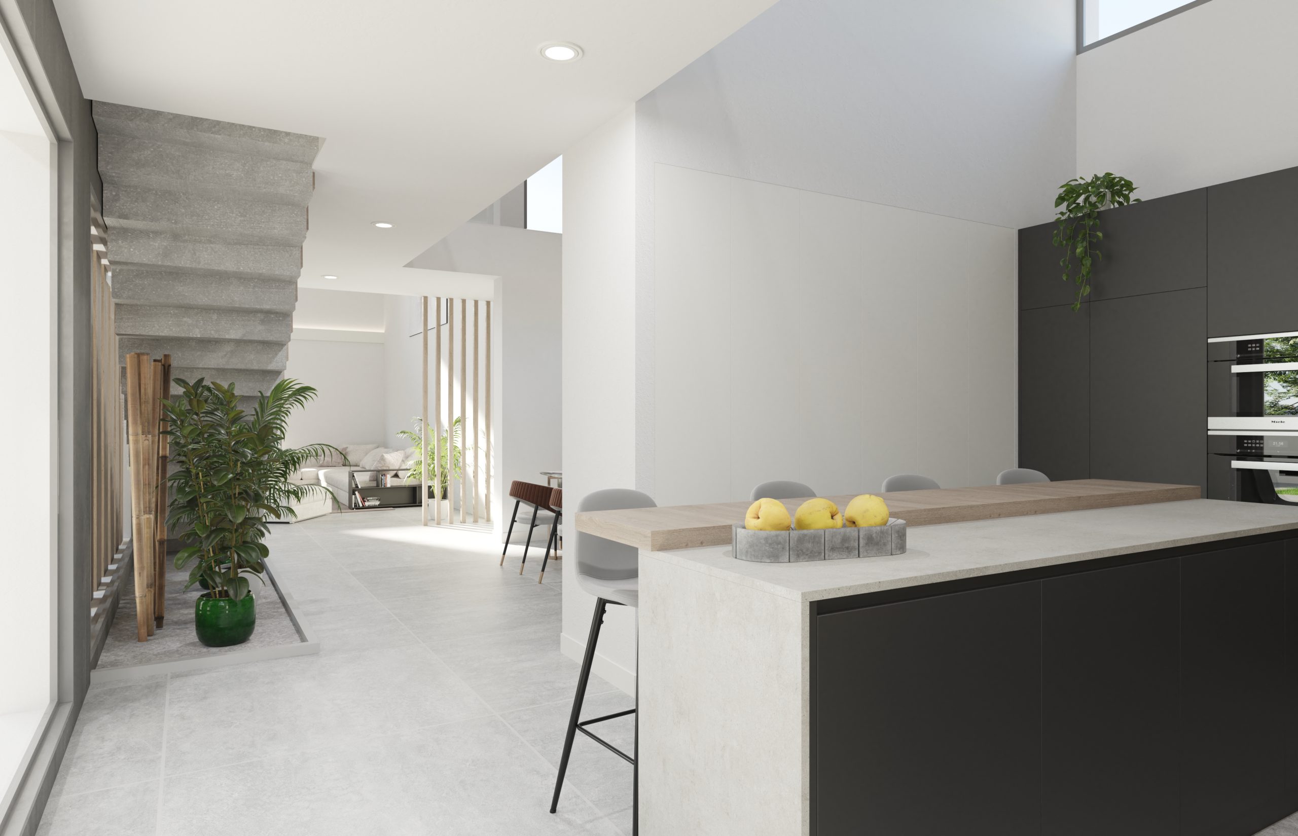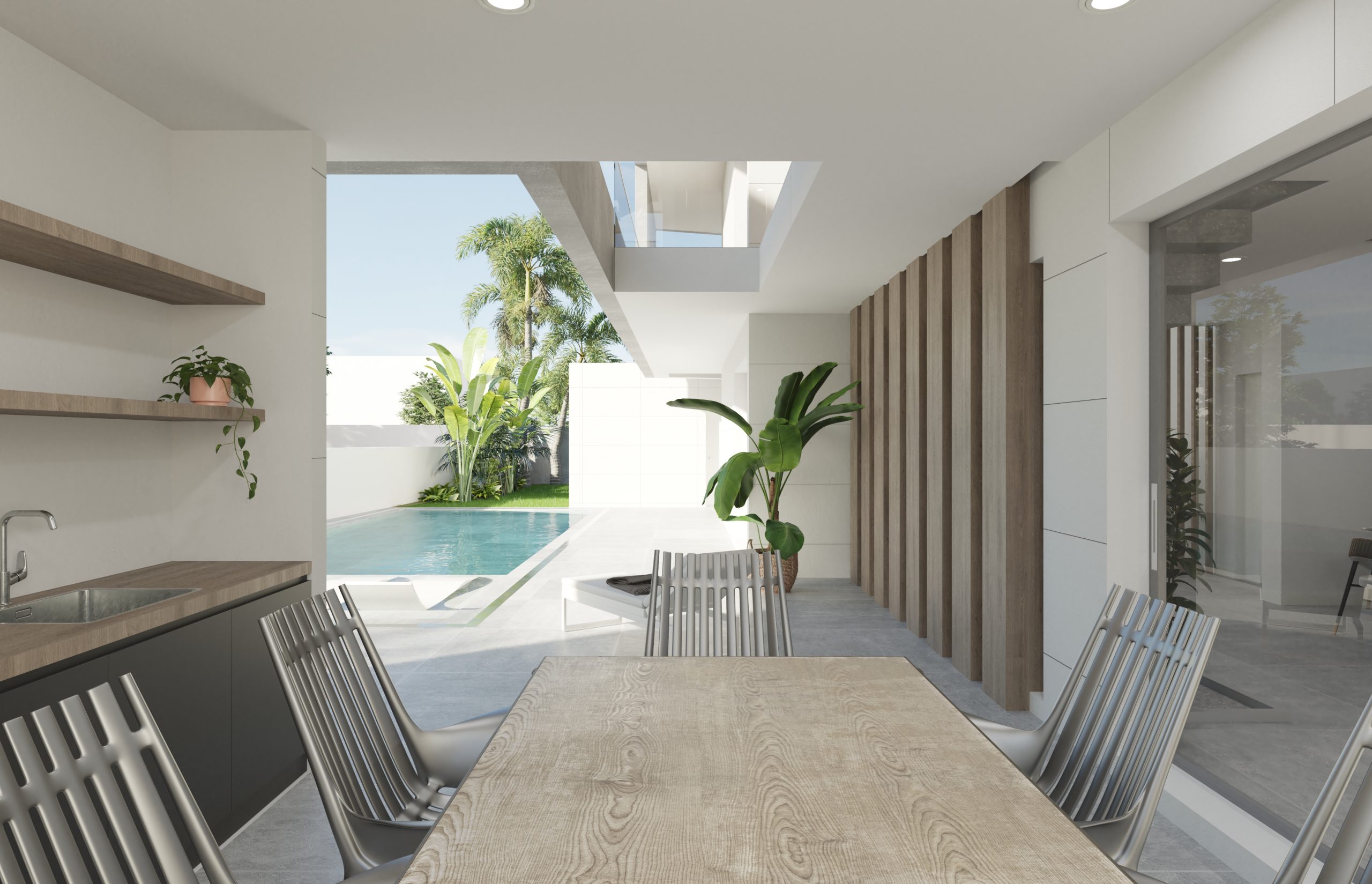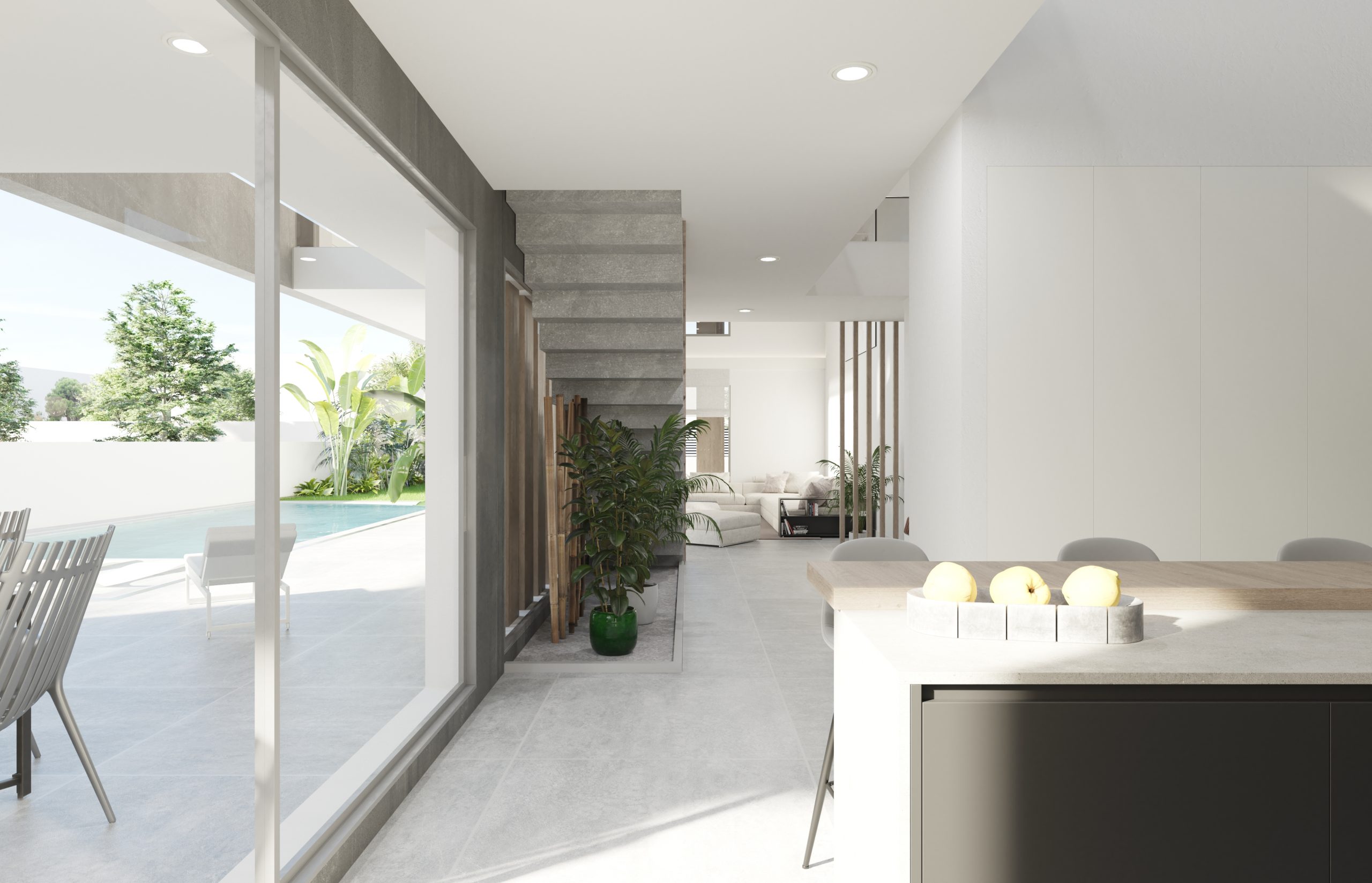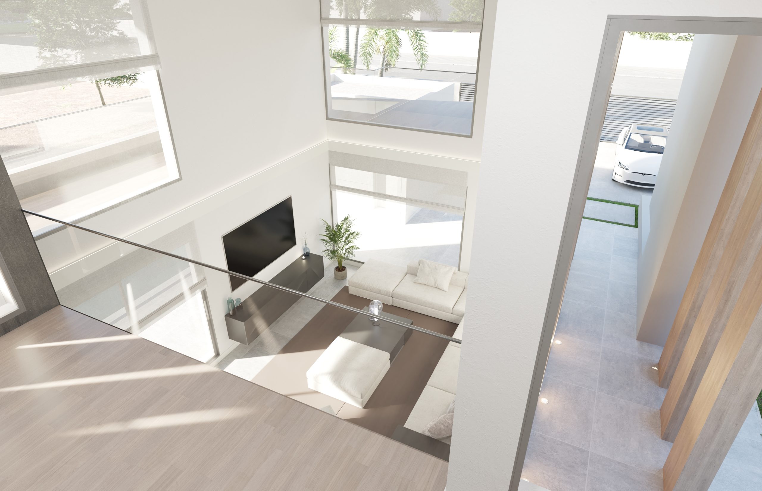 Juego de luces y volúmenes. La imagen del diseño elegido para la fachada principal de este proyecto transmite mucha fuerza y elegancia. Vivienda resuelta con dobles alturas, amplias terrazas y espacios muy abiertos al exterior. La entrada a la vivienda se ha resuelto como un elemento escultural y sin duda ha adquirido un protagonismo especial.